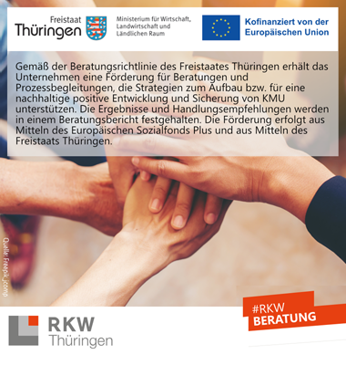 Gemäß der Beratungsrichtlinie des Freistaates Thüringen erhält unser Unternehmen eine Förderung für Beratungen und Prozessbegleitungen. Diese unterstützen Strategien zum Aufbau und zur nachhaltigen positiven Entwicklung und Sicherung von KMUs. Die daraus resultierenden Ergebnisse und Handlungsempfehlungen werden in einem Beratungs- bericht festgehalten. Die Förderung erfolgt aus Mitteln des Europäischen Sozialfonds Plus und aus Mitteln des Freistaats Thüringen.